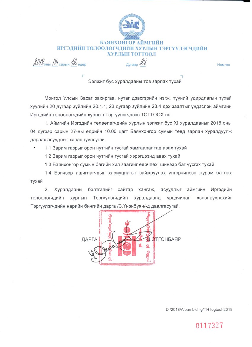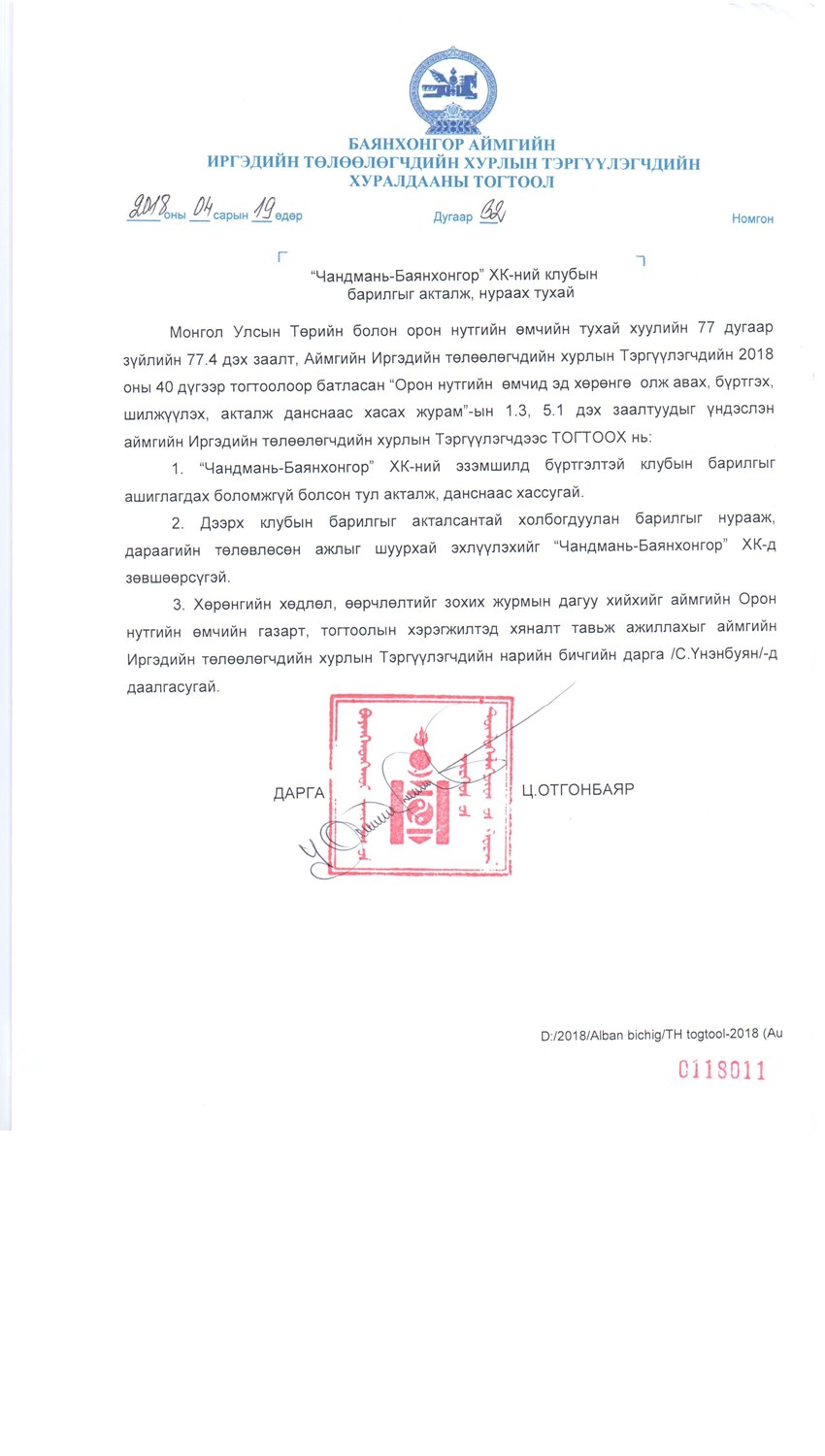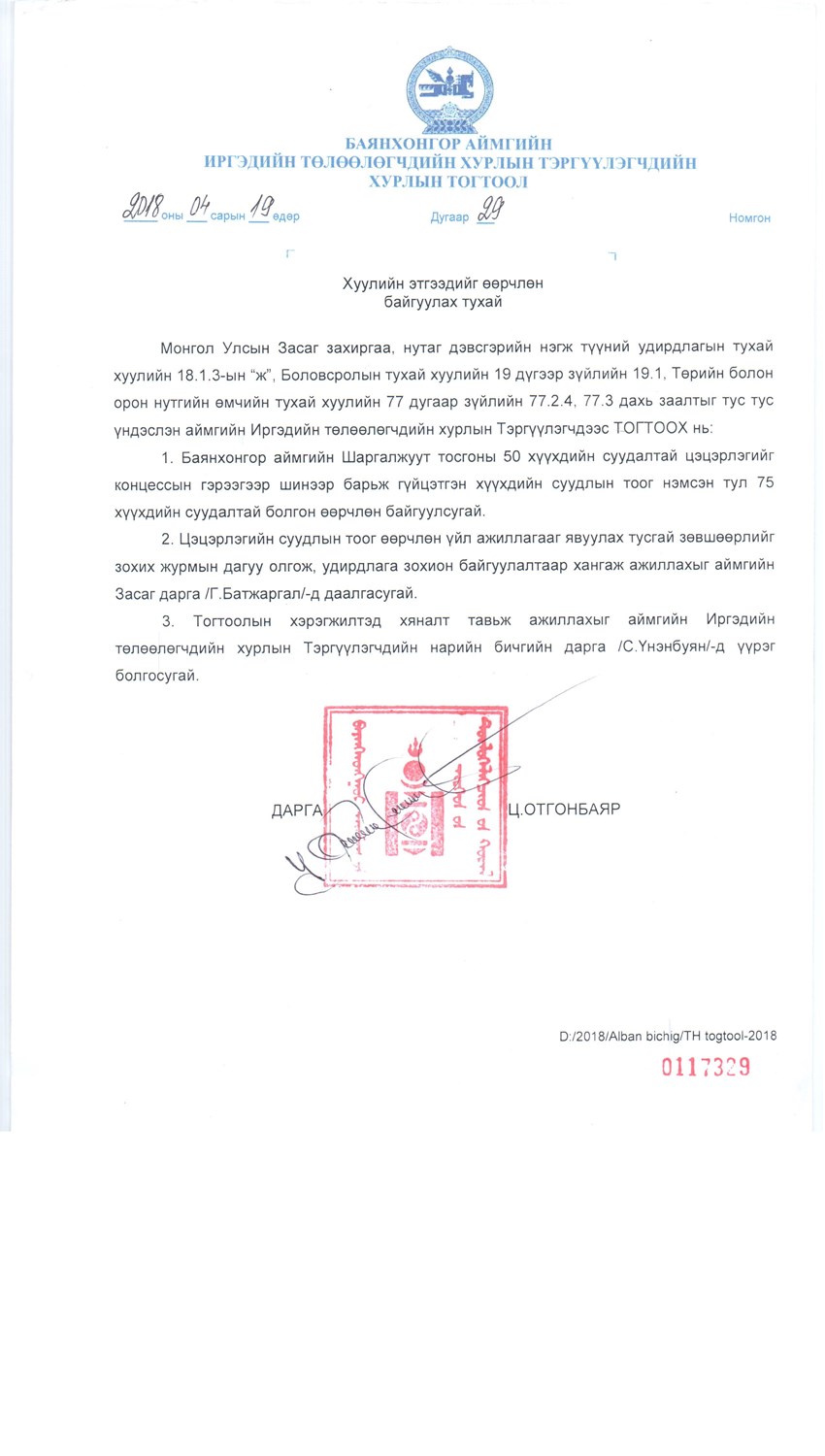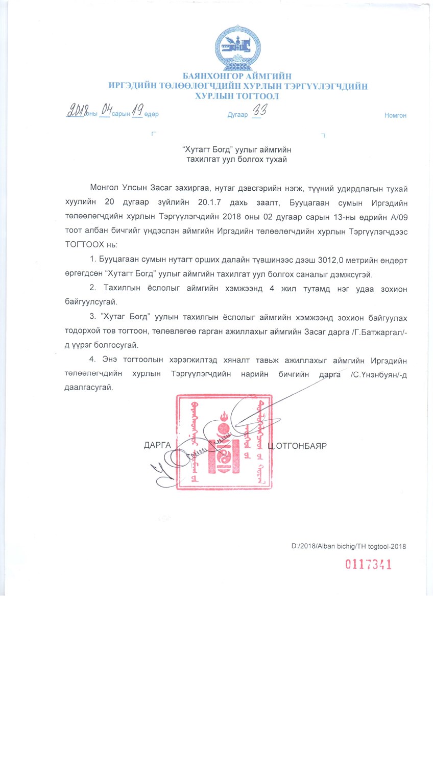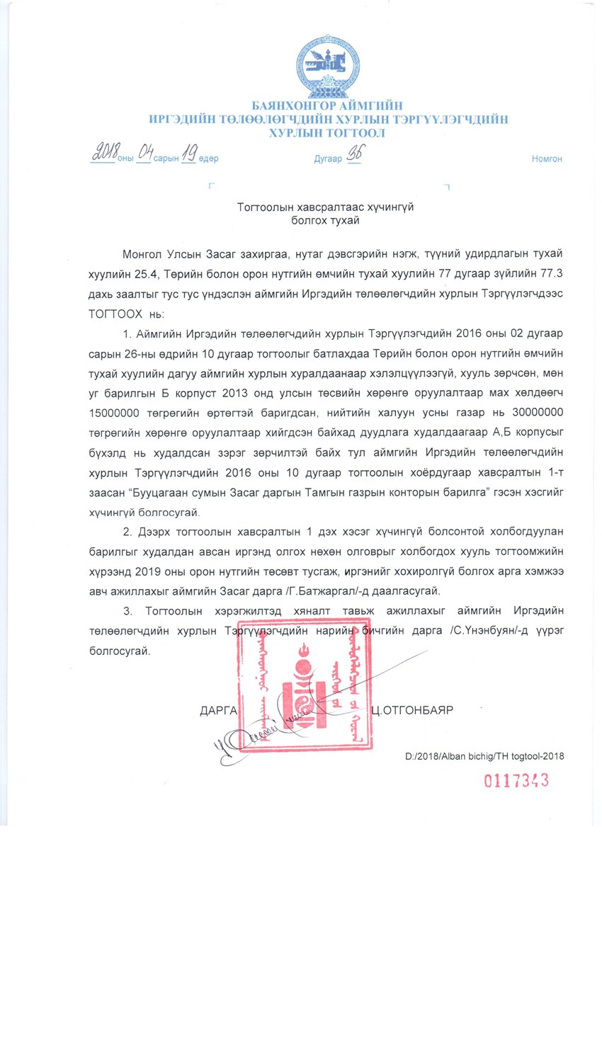 Аймгийн Иргэдийн төлөөлөгчдийн хурлын 2018.04.19-ний өдрийн Тэргүүлэгчдийн хуралдааны тогтоолууд